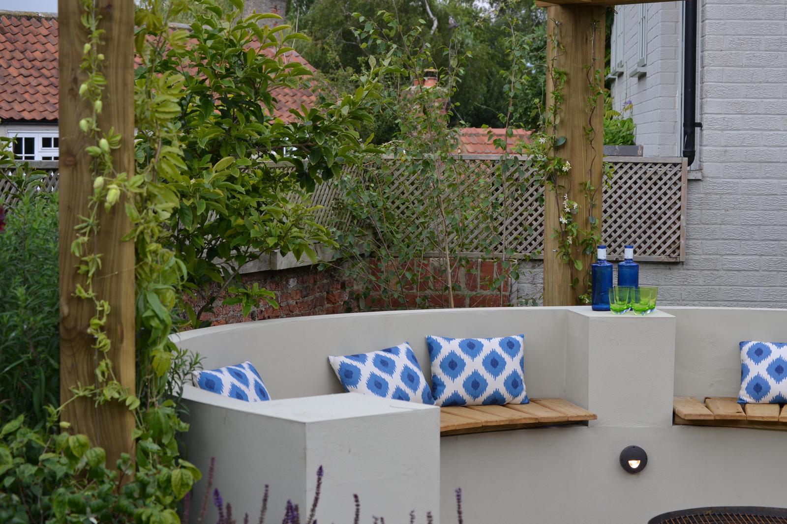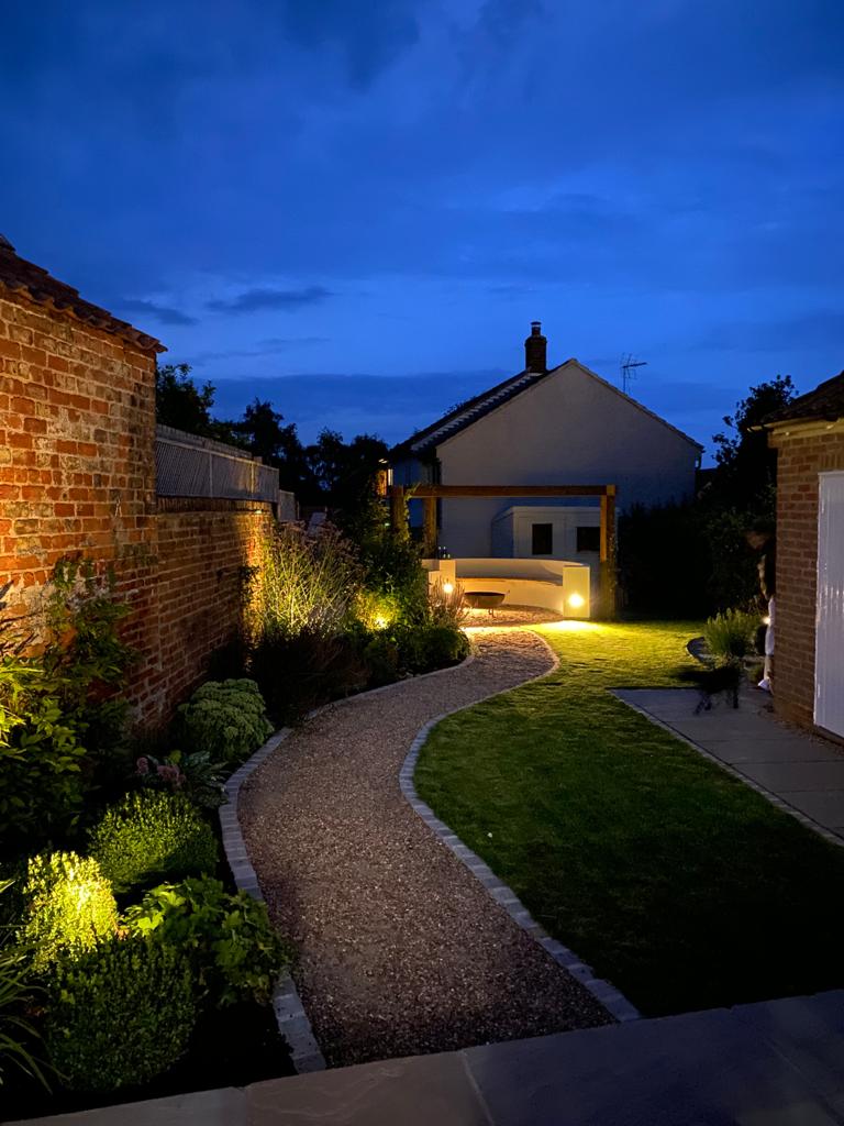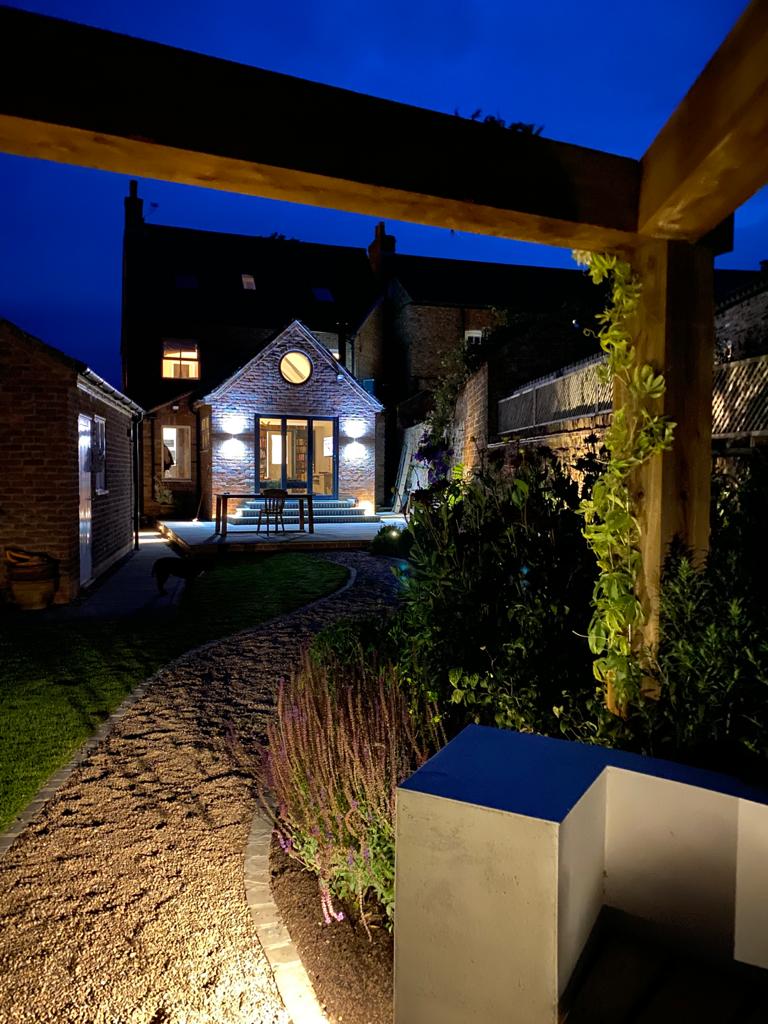 A garden transformed by the addition of a structure (pergola) patio, and lighting. These images highlight how structures, lighting and exacting planting and plant selection provide an enticing shaded daytime seating area and the addition of subtle lighting extends its use into the evening. This design combines green oak, locally sourced reclaimed York stone, low Buxus hedging and mixed perennial planting.